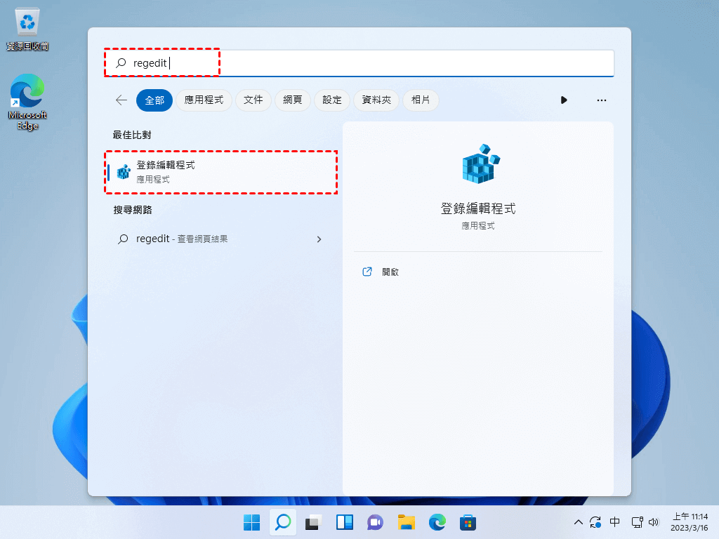 步驟1. 點選開始按鈕,鍵入 regedit ,然後在結果中選擇登錄編輯程式。