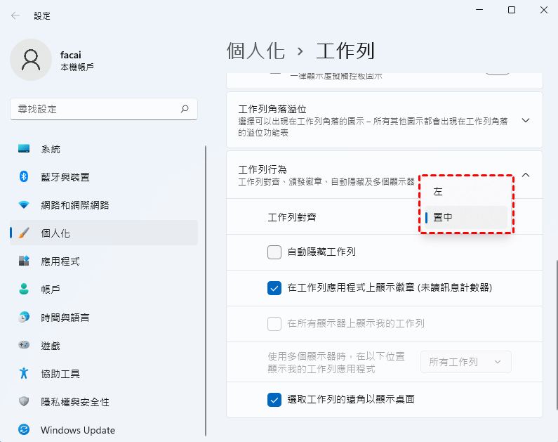 - 01:將Windows 11工作列移動到螢幕頂部。