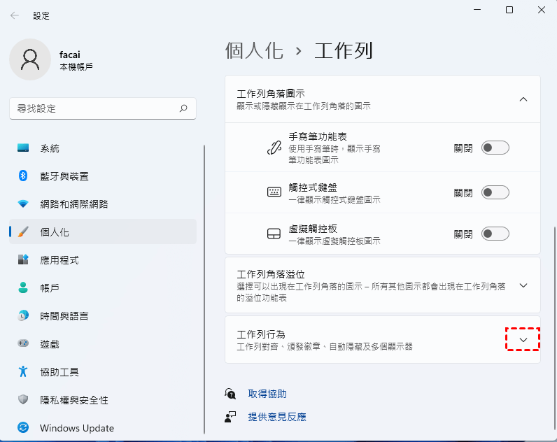 步驟2. 通過點選倒三角形符號展開工作列行為。