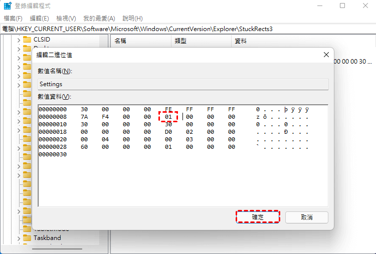 電腦\HKEY_CURRENT_USER\Software\Microsoft\Windows\CurrentVersion\Explorer\StuckRects3