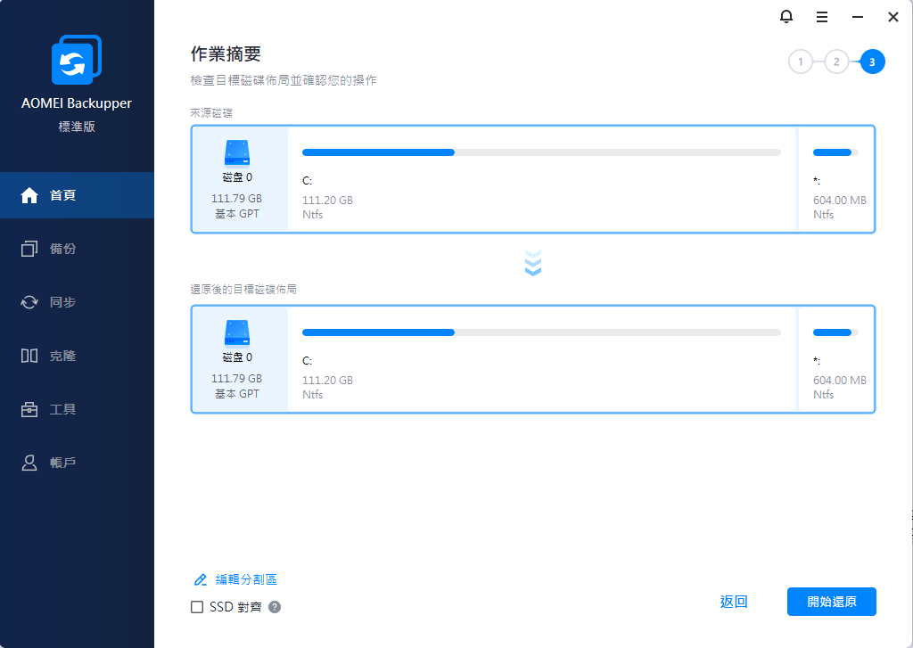 - 如果還原目標是SSD,您可以選中SSD對齊選項,以優化目標SSD的讀寫速度。