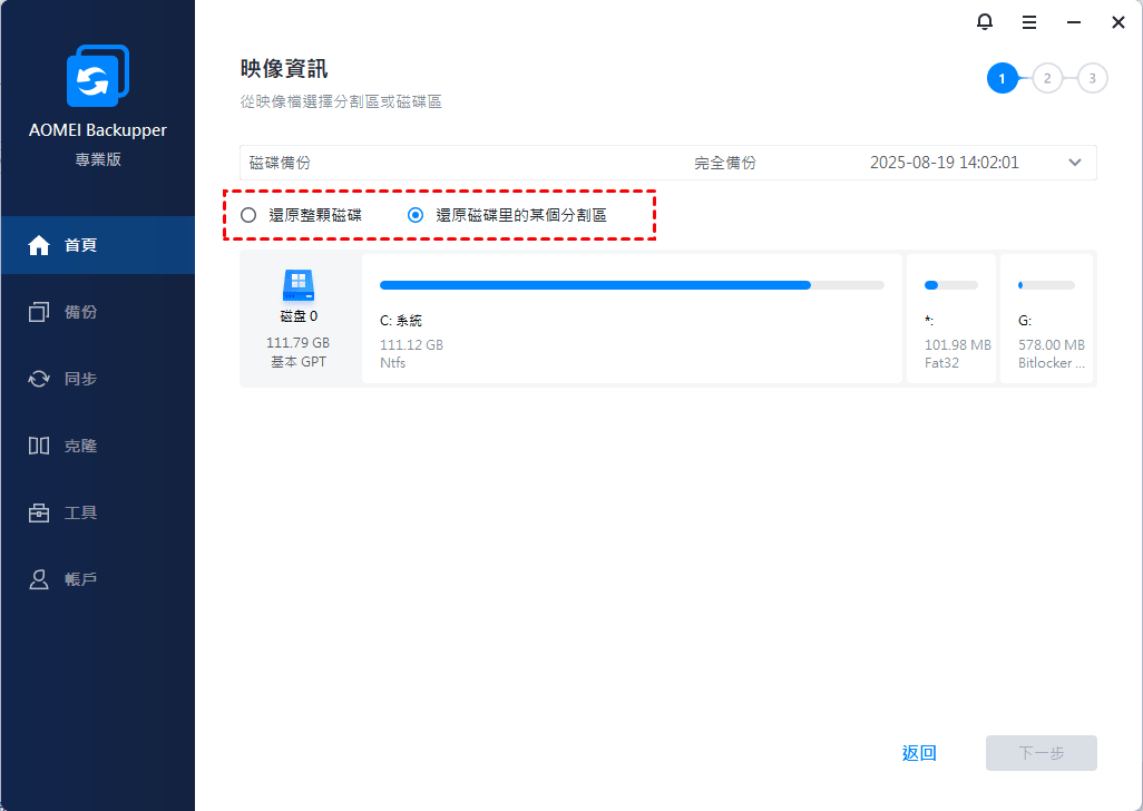 選擇要還原整個硬碟或分割區,然後點擊下一步。