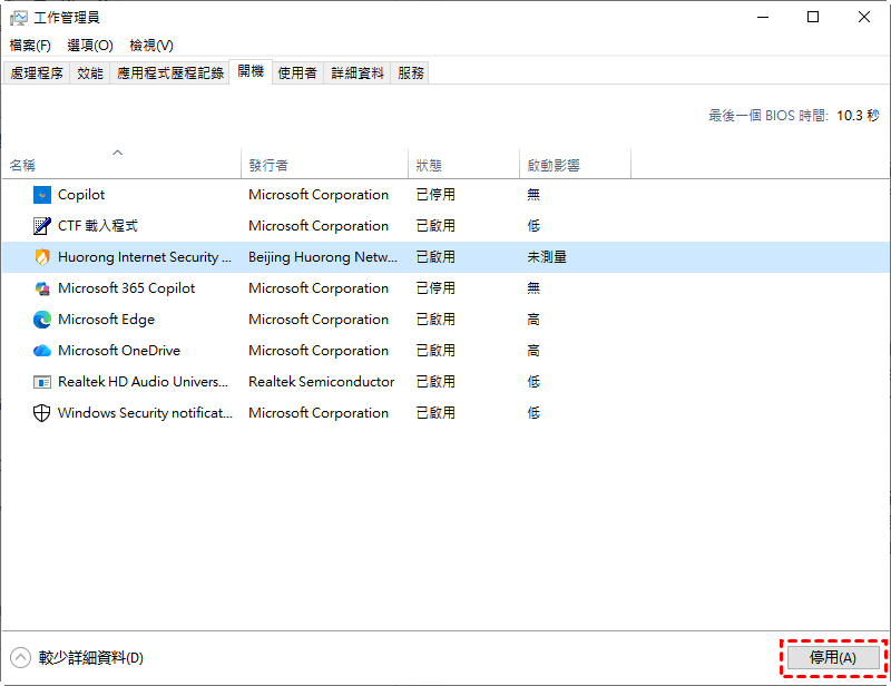 步驟4. 找到第三方防毒軟體,並點選右下角的停用按鈕。
