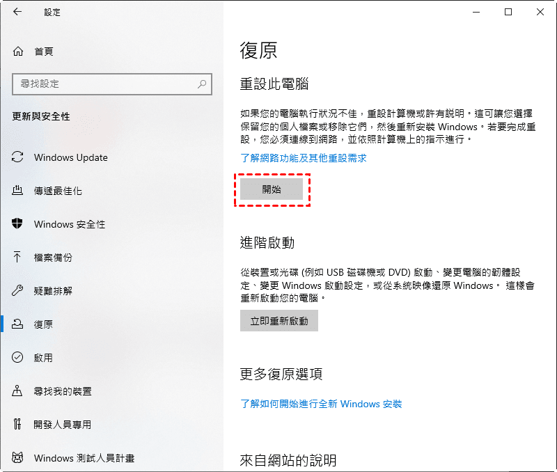 步驟2. 切換到左側視窗中的“復原”標籤,在右側視窗中找到“重設此電腦”,然後點選“開始”按鈕。