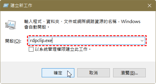 步驟4. 在“建立新工作”視窗中,輸入rdpclip.exe,然後點選“確定”按鈕。