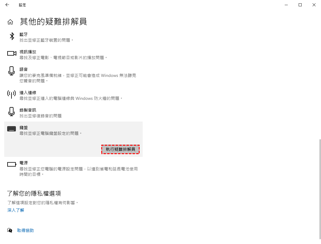 步驟2. 按一下“其他疑難排解員”,在新視窗中找到“鍵盤”,然後按一下“執行疑難排解員”按鈕。