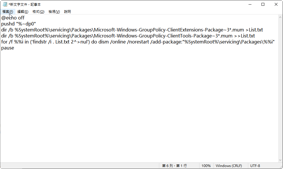 @echo off pushd "%~dp0"dir /b %SystemRoot%\servicing\Packages\Microsoft-Windows-GroupPolicy-ClientExtensions-Package~3*.mum >List.txt dir /b %SystemRoot%\servicing\Packages\Microsoft-Windows-GroupPolicy-ClientTools-Package~3*.mum >>List.txt for /f %%i in ('findstr /i . List.txt 2^>nul') do dism /online /norestart /add-package:"%SystemRoot%\servicing\Packages\%%i"pause