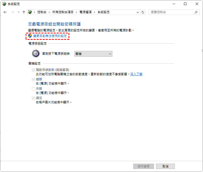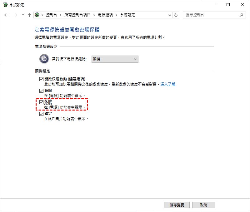 步驟5. 關機設定部分將顯示。勾選休眠選項並點選儲存更改。