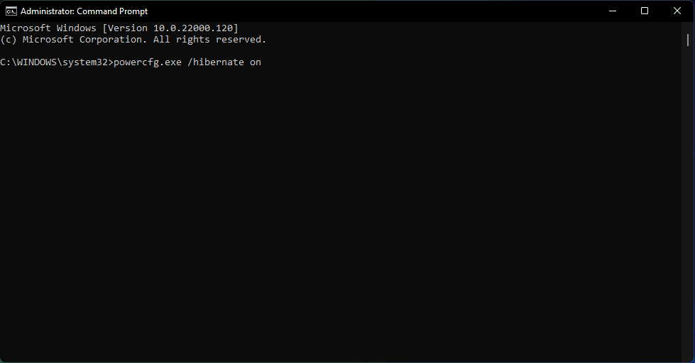 步驟 2. 在命令提示字元視窗中,鍵入powercfg.exe /hibernate on並按 Enter。
