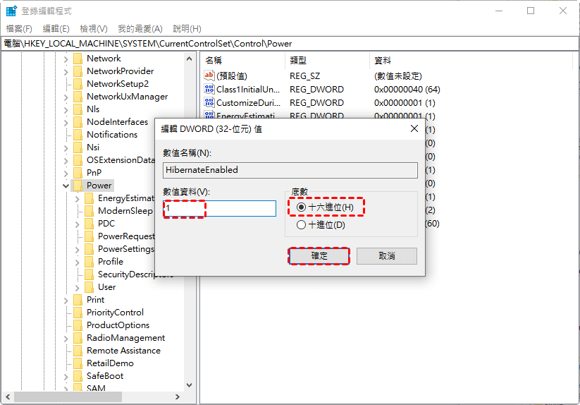 步驟 3. 然後輕按兩下Hibernate Enable Default 檔案並在數值資料中鍵入1,並點選確定。
