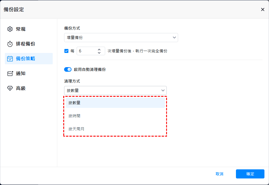 備份策略: 它允許您更換備份方式或啟動自動清理備份功能,部分功能需升級到進階版才能使用。
