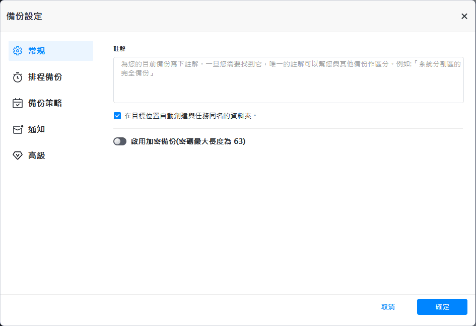 排程備份: 您可以設定自動備份,例如每天、每週、每月、事件觸發等。