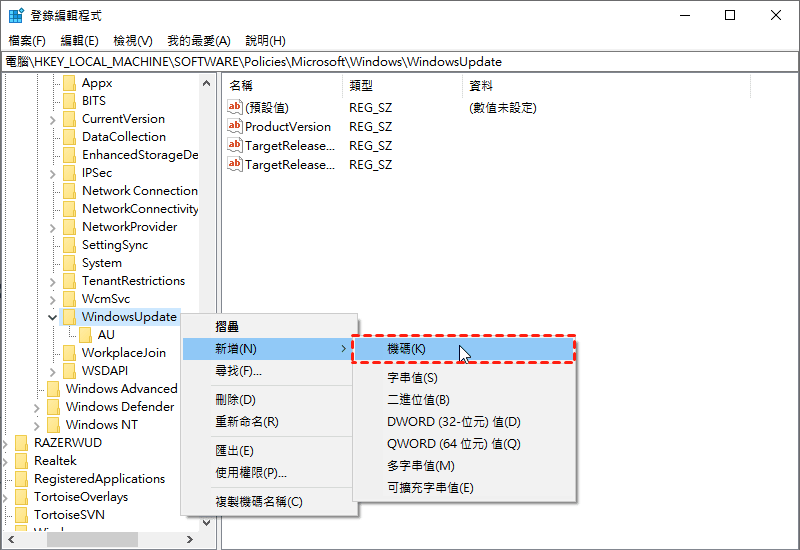 步驟2. 導航到以下路徑,右鍵點擊並選擇新增>字串值。然後,輕按兩下新的登錄檔設定,將其命名為“TargetReleaseVersion”,並將其值設定為 1。