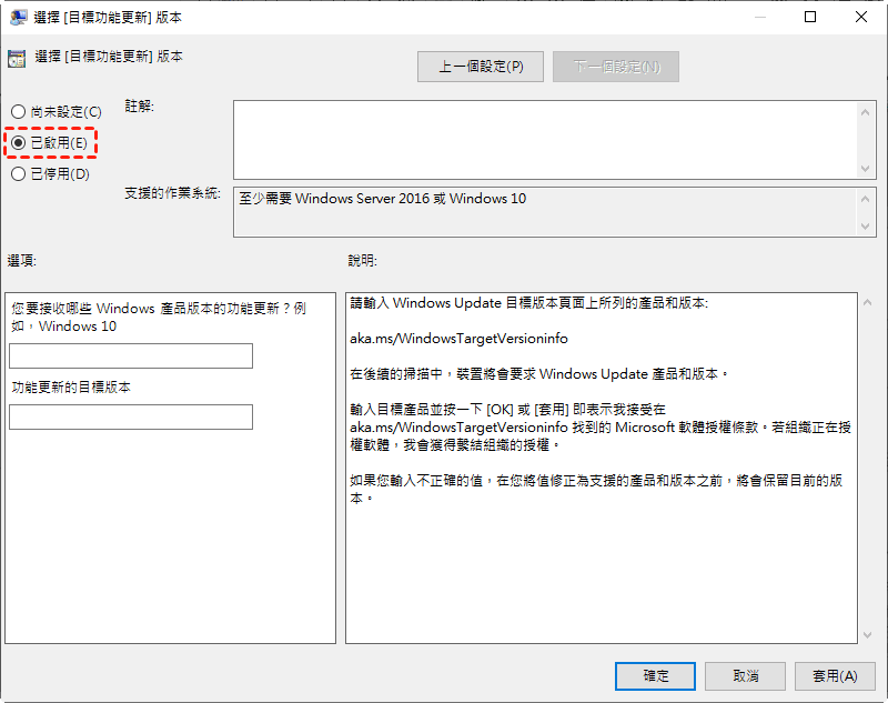步驟3. 捲動至選項方塊,在產品版本中設定為 Windows 10,並在功能更新的目標版本中設定為 22H2。然後,按一下套用>確定以保存變更並關閉對話方塊。