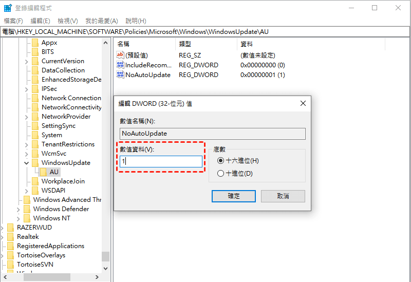 步驟2. 選擇新的登錄檔鍵「AU」,在右側面板中,右鍵點擊空白處,選擇新增>DWORD (32 位) 值。然後,輕按兩下該值,將值名稱設定為NoAutoUpdate,將值資料從 0 變更為 1。