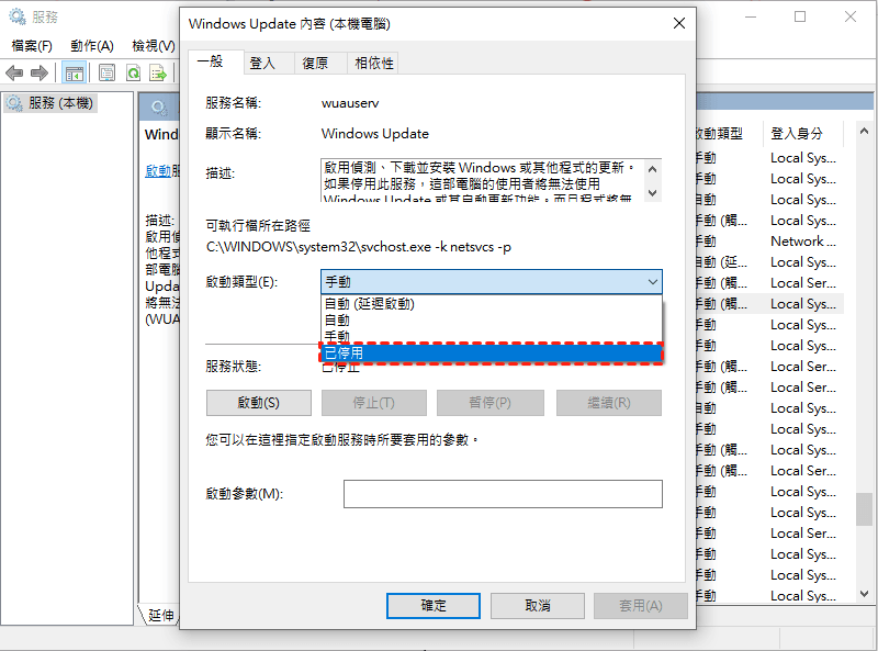 步驟3. 接著,輕按兩下Windows Update選項,將其啟動類型設定為已停用。
