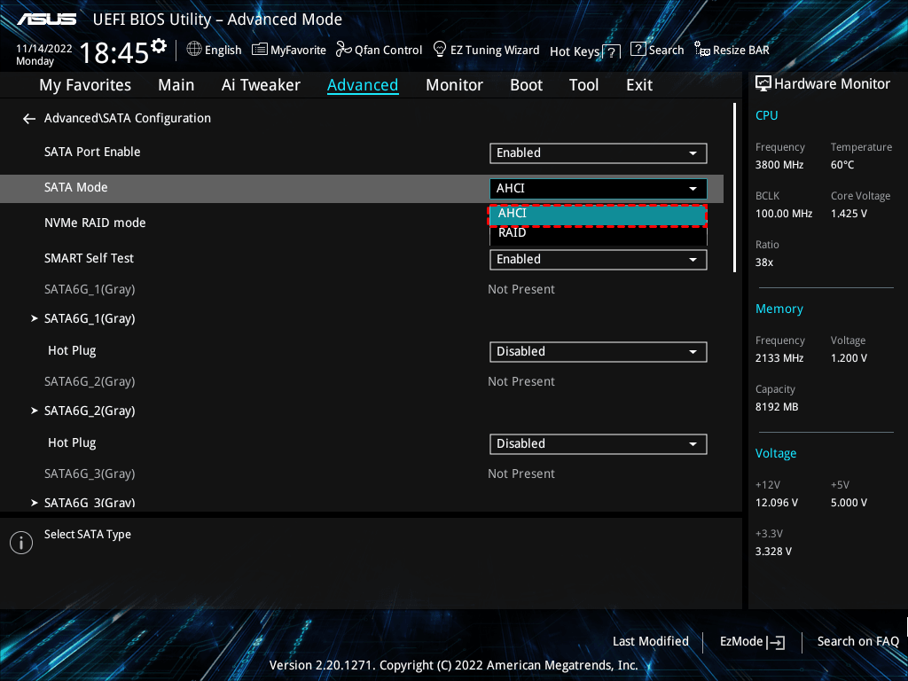 步驟2. 在進階選項菜單中,將 SATA 的模式變更為 AHCI,點選 F10 儲存並離開 BIOS。