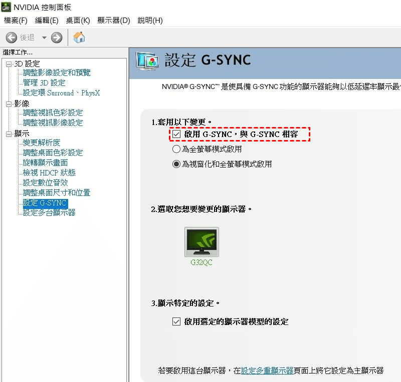 步驟2. 前往顯示標籤,然後點選設定 G-SYNC。然後,取消選取啟用 G-SYNC 和 G-SYNC 相容選項。
