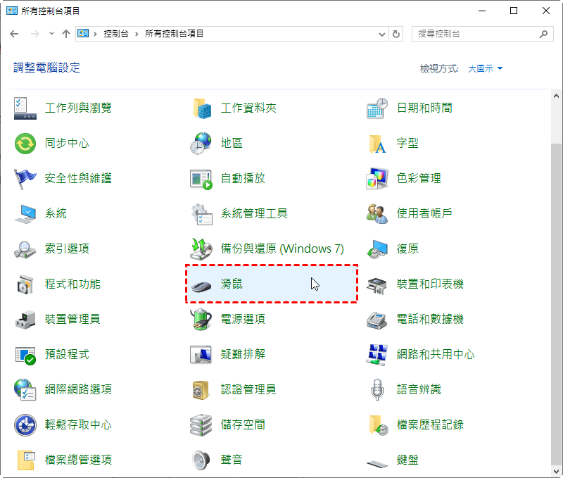 步驟2. 在控制台中,從右上方將檢視方式切換為大圖示,找到並點選滑鼠。