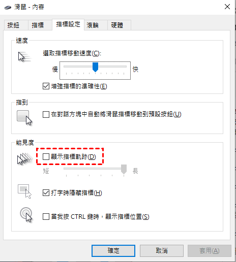 步驟4. 在可見性部分下,取消勾選顯示指標軌跡旁的方塊以停用印表機軌跡。