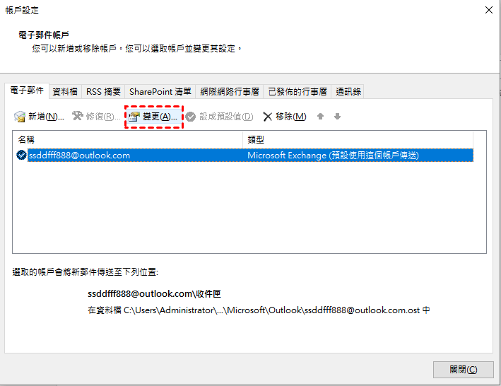 步驟2. 在帳戶設定視窗中,選擇密碼錯誤的帳戶並點選“變更...”按鈕。