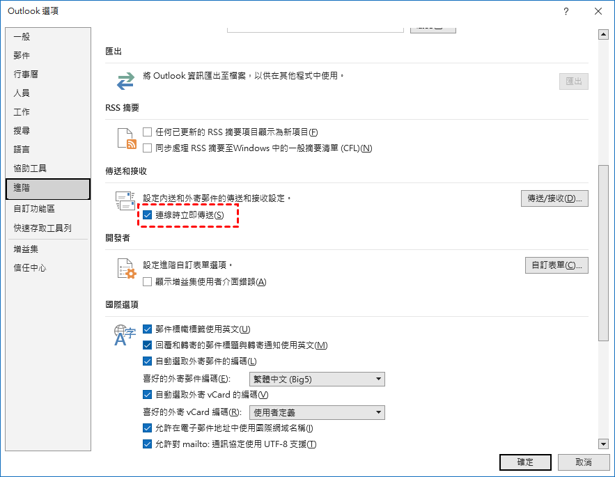 步驟3. 向下滾動到發送和接收部分並選中“連線時立即傳送”。然後,點選“確定”。