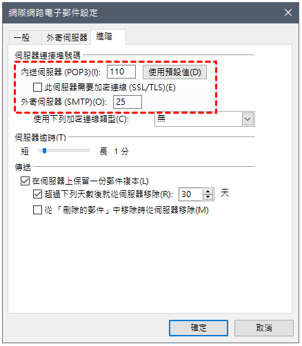 ★ POP 帳戶通常在埠110 上運行。如果您使用Gmail 作為POP 帳戶,請在“內送伺服器(POP3)”字段中輸入995,在“外寄伺服器(SMTP)”字段中輸入465。選擇選項“此伺服器需要加密連線 (SSL)”。