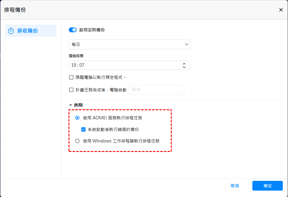 步驟 5. 回到備份介面後,請點選“開始備份”按鈕以開始執行 Outlook 電子郵件備份。 請注意,在開始備份前,您可以設定“定時備份”,以啟用“每日”、“每週”、“每月”或“事件觸發”計劃備份。