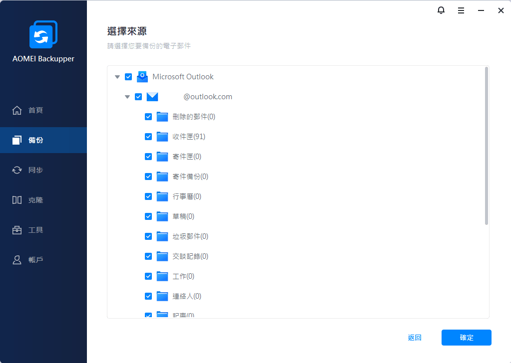 步驟 3. 點選“選擇來源”,並新增Outlook信箱的帳戶。選取想要備份的Outlook郵件,點選確定按鈕。