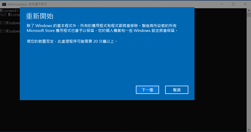 方法4. 使用命令列重設 Windows 10 以重新開始