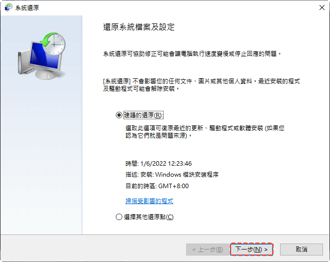 4. 此命令將帶您進入系統還原界面。您可以使用推薦的還原點或選擇其他還原點。然後,點選“下一步”並按照說明完成系統還原。