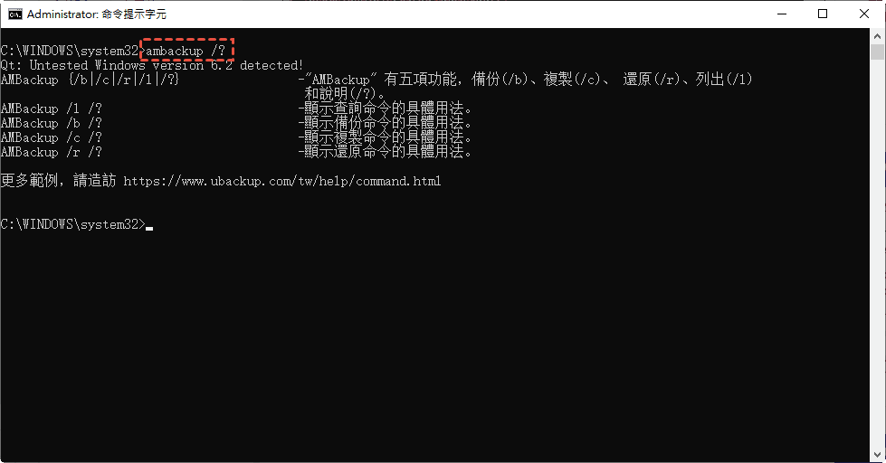 在復原系統之前,您可以使用查看映像功能檢查系統映像備份是否完整且沒有錯誤。另外,您需要了解一些您將使用到的參數,請輸入“ambackup /?”,在命令提示字元視窗中取得它們。
