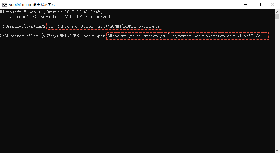 2. 執行以下命令開始恢復: AMBackup /r /t [備份類型] /s "[備份位置路徑]" /d [目標位置]。例如:要將儲存在 J:\systembackup1 中的系統備份恢復到磁碟 1。您應該鍵入命令:AMBackup /r /t system /s “J:\system backup\systembackup1.adi” /d 1。