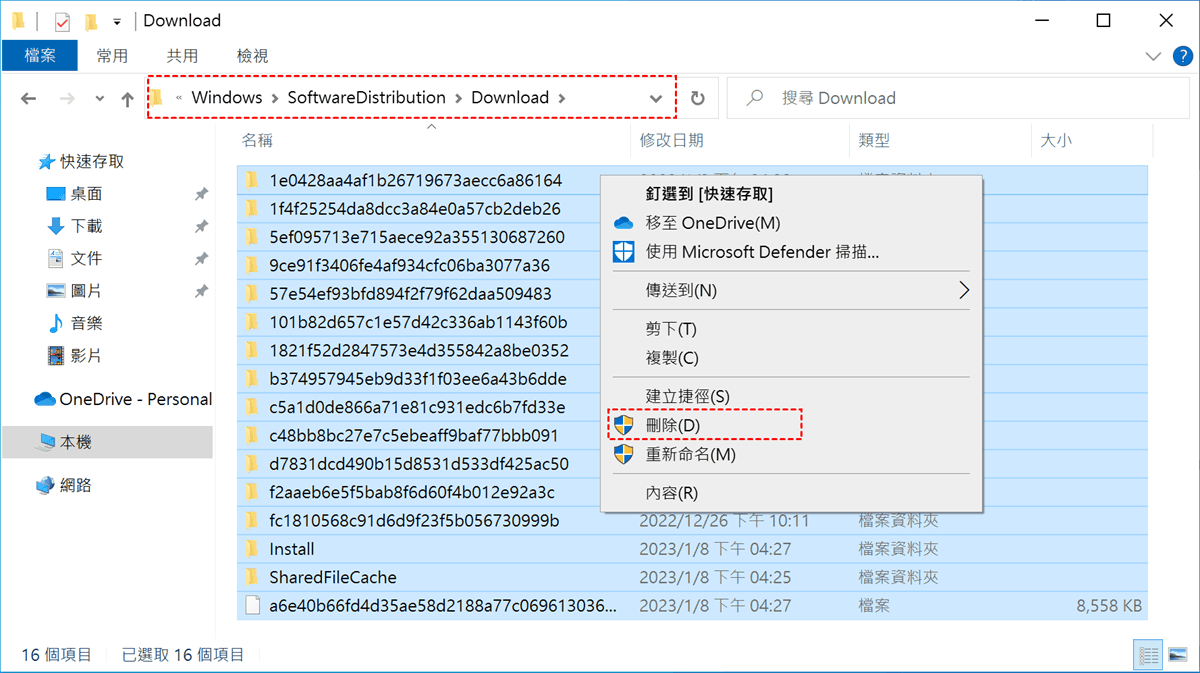 步驟2. 前往 C:\Windows\SoftwareDistribution\Download,並刪除其中的所有檔案。這樣就清除了 Windows Update快取。
