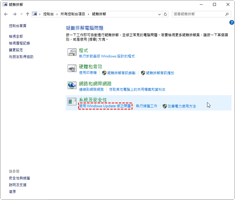 如果您找不到 "其他疑難排解員" 選項,則可以在 "控制台" 中找到它(以大圖示或小圖示檢視)> "疑難排解" > "使用 Windows Update 修正問題"。