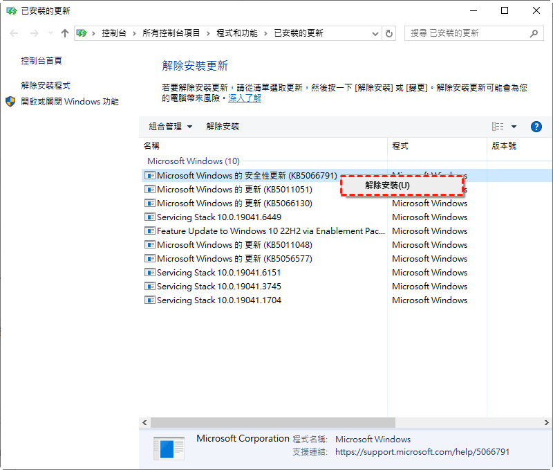 在彈出的視窗中,您可以選擇要刪除的更新,然後解除安裝它。