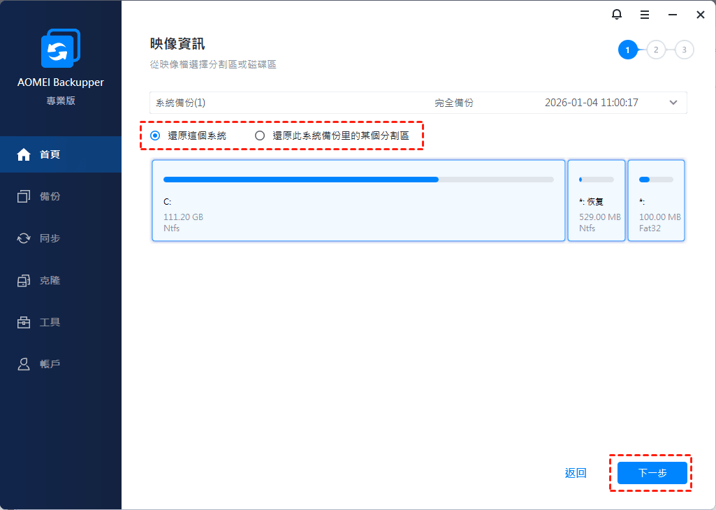 步驟3. 選擇還原這個系統或者某個分割區,再點選下一步。
