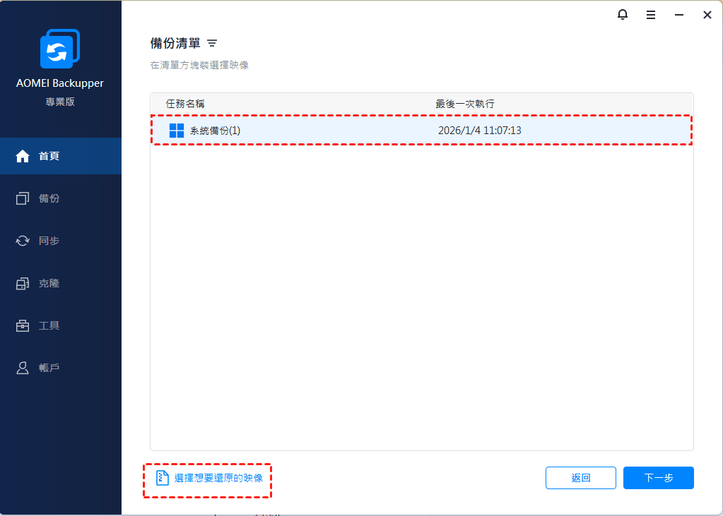 步驟2. 從備份清單中選取想要還原的備份任務(系統備份),點選下一步。請注意,您也可以點選“選擇想要還原的映像”來選擇備份映像。