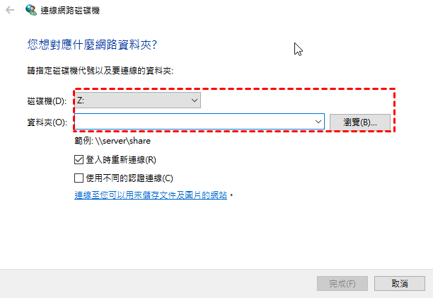 步驟3. 進入這台電腦,選擇映射網路磁碟機。然後,選擇磁碟機代號並輸入網路路徑(源電腦的IP位址),點擊完成。