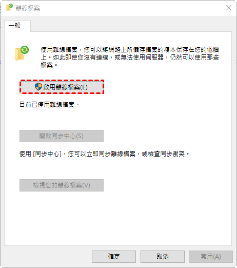 步驟2. 點擊管理離線檔案>啟用離線檔案>確定。這需要您重新啟動電腦,否則無法啟用離線檔案資料夾。