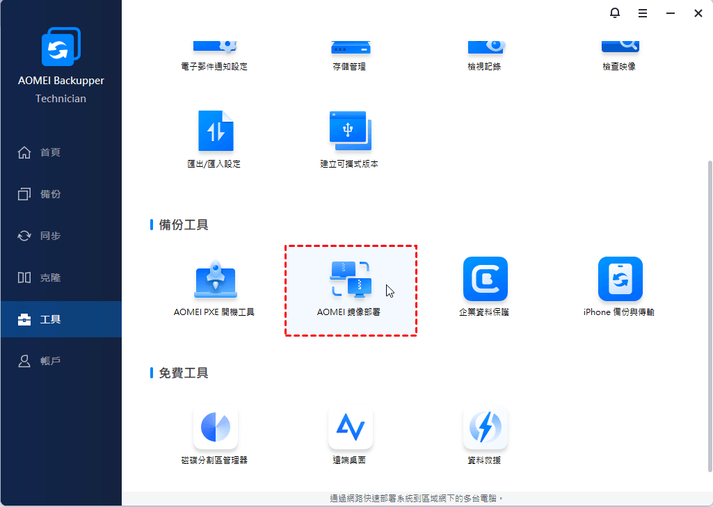 步驟1. 當準備好sysprep的Windows映像後,您可以轉到工具選項卡,選擇映像部署工具以部署剛剛建立的系統映像。