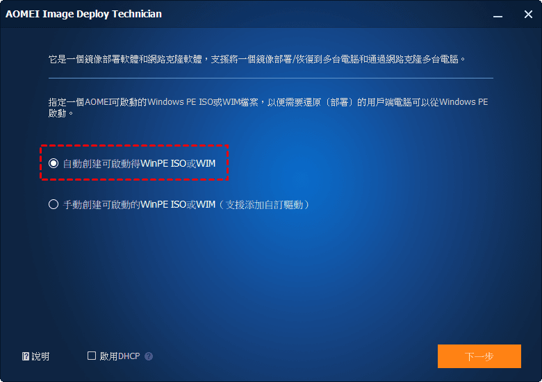 在區域網路中進行系統部署時,必須有一個DHCP伺服器。如果沒有,請勾選啟用DHCP選項。