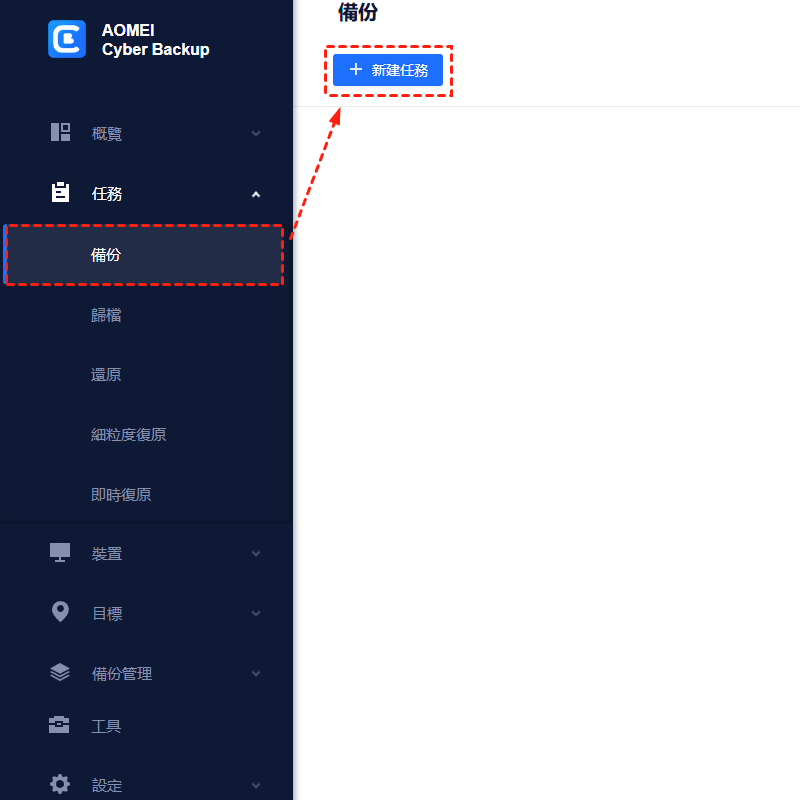 若要對用戶端電腦進行備份,只需登入AOMEI Cyber Backup,然後新增要備份的 Windows 裝置即可。然後點擊左側選單列上的「備份任務」,然後選擇「備份任務」>「建立新任務」。