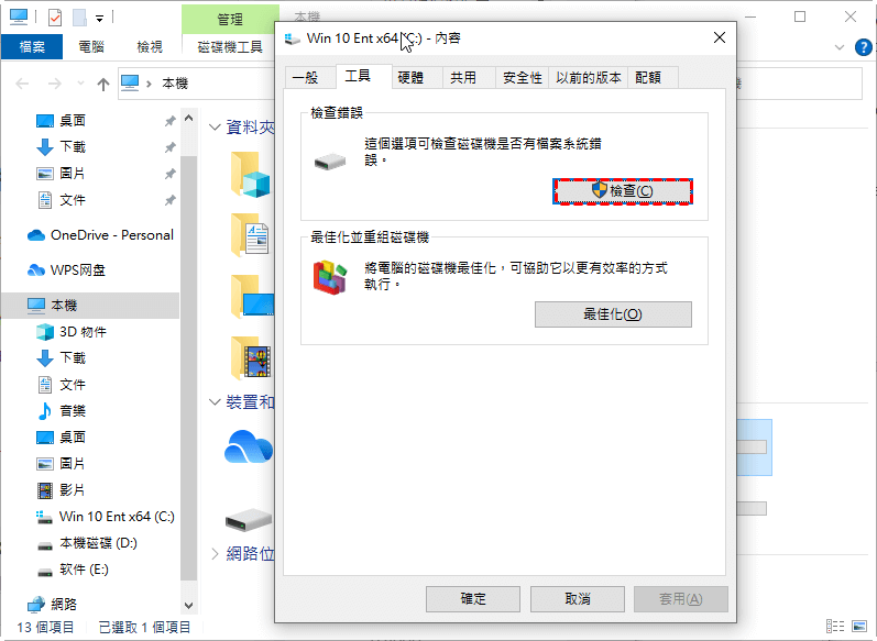 步驟2. 切換到工具標籤,點選錯誤檢查下的檢查以檢查硬碟是否存在檔案系統錯誤。