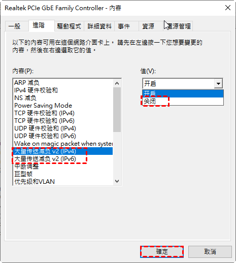 步驟4. 切換到進階標籤,選擇大量傳送減負V2 (IPv4) 並將值設定為關閉,大量傳送減負V2(IPv6)也是如此。點選確定。
