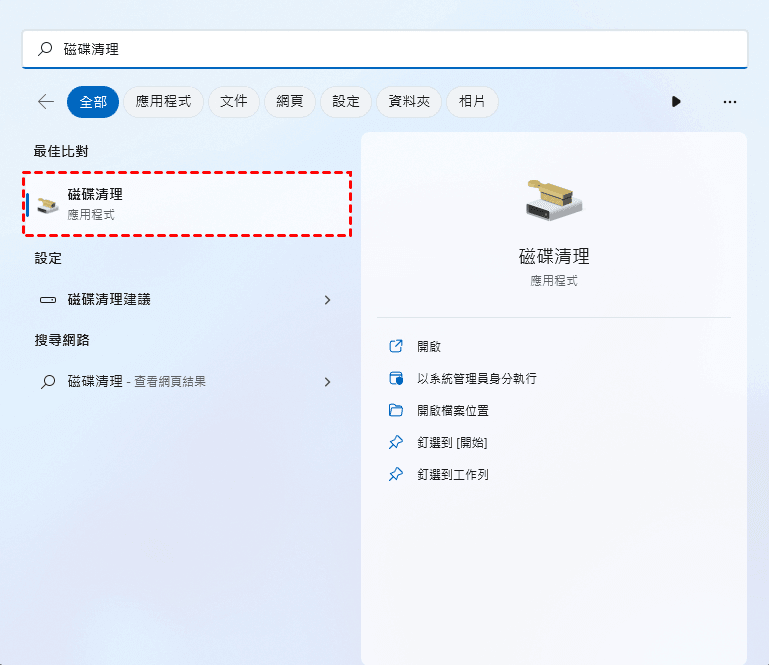 步驟1. 打開Windows搜索欄,輸入“磁碟清理”並按Enter打開磁碟清理工具。