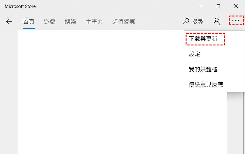 步驟2. 當您進入 Microsoft Store 介面時,點選操作圖示(螢幕右上角),然後點選「下載與更新」。
