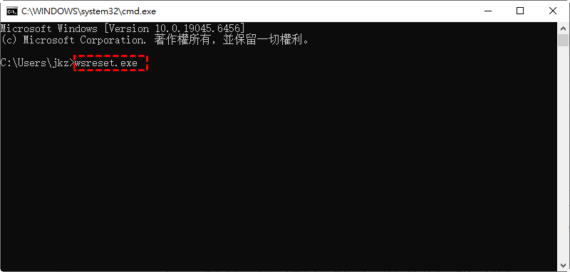 步驟2. 當您在提升的命令提示字元介面中時,鍵入 wsreset.exe 並按 Enter 以重置 Microsoft Store。