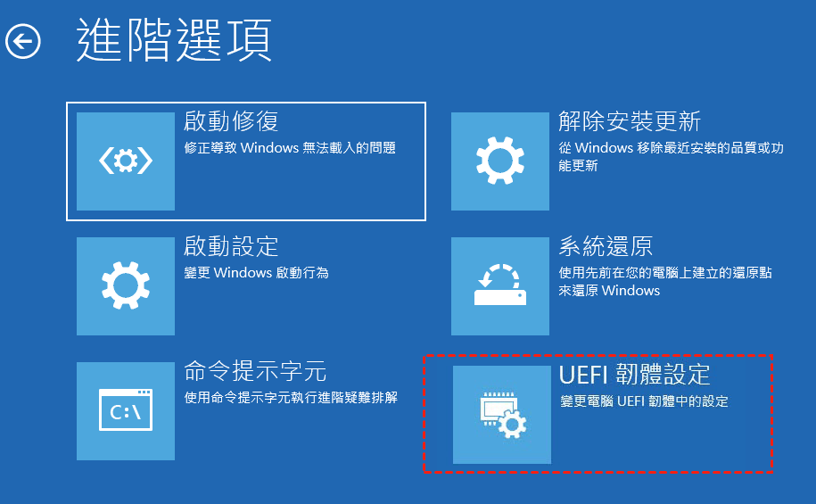 步驟2. 它將打開一個帶有進階菜單的藍屏,然後點擊“疑難排解”>“進階選項”>“UEFI韌體設定”。