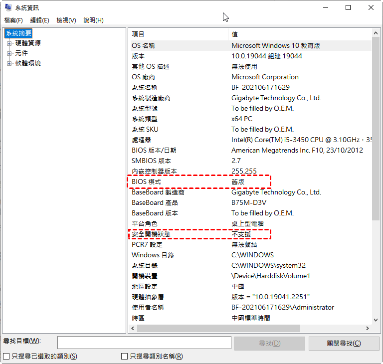 如果BIOS模式顯示為舊版,而安全開機狀態顯示為不支援,則表示已禁用安全開機。這是因為您的系統安裝在MBR磁碟上。